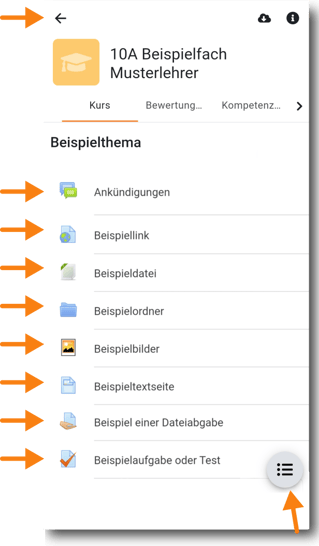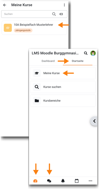 Kurse sind in Abschnitte unterteilt, die Informationen, Material oder Aktivitäten enthalten. Falls Dir nur ein Thema angezeigt wird, kannst Du zur Liste mit allen Abschnitten wechseln. Aktualisiere den Kurs, indem Du nach unten wischst. So bleibst Du immer auf dem neusten Stand. Wähle ein Material, um es abzurufen, oder eine Aktivität, um sie zu bearbeiten. Falls Du Probleme in einem Kurs hast, kannst Du die Kurslehrerinnen und -lehrer über Moodle oder per E-Mail unter ihrem Nachnamen @burggymnasium.de erreichen. Du kannst in unserem Kurs Digitales Lernen den Umgang mit der Lernplattform üben.