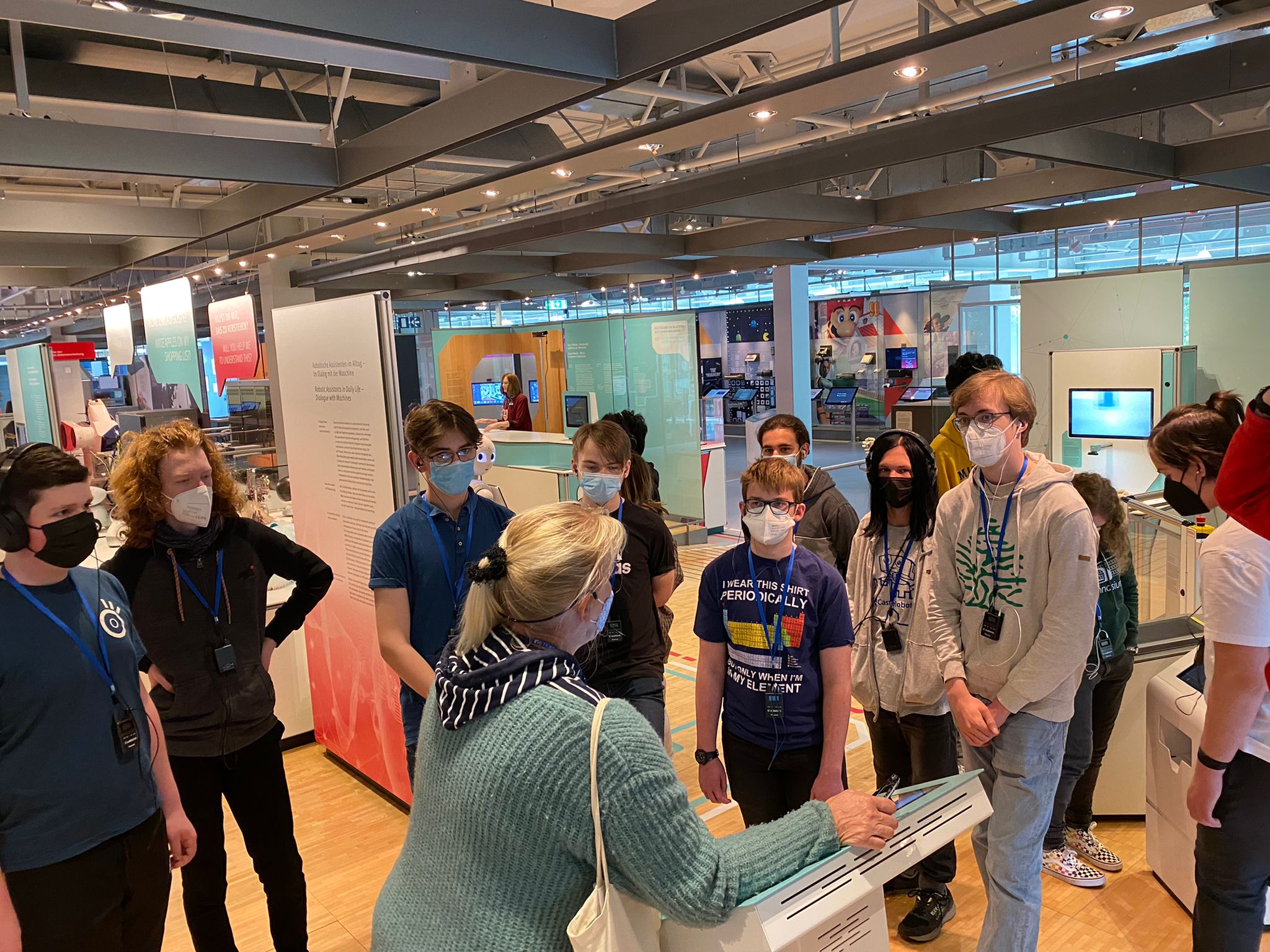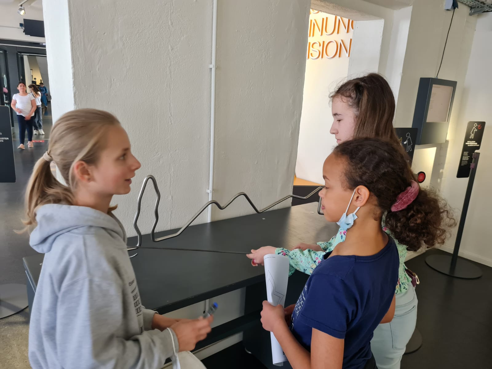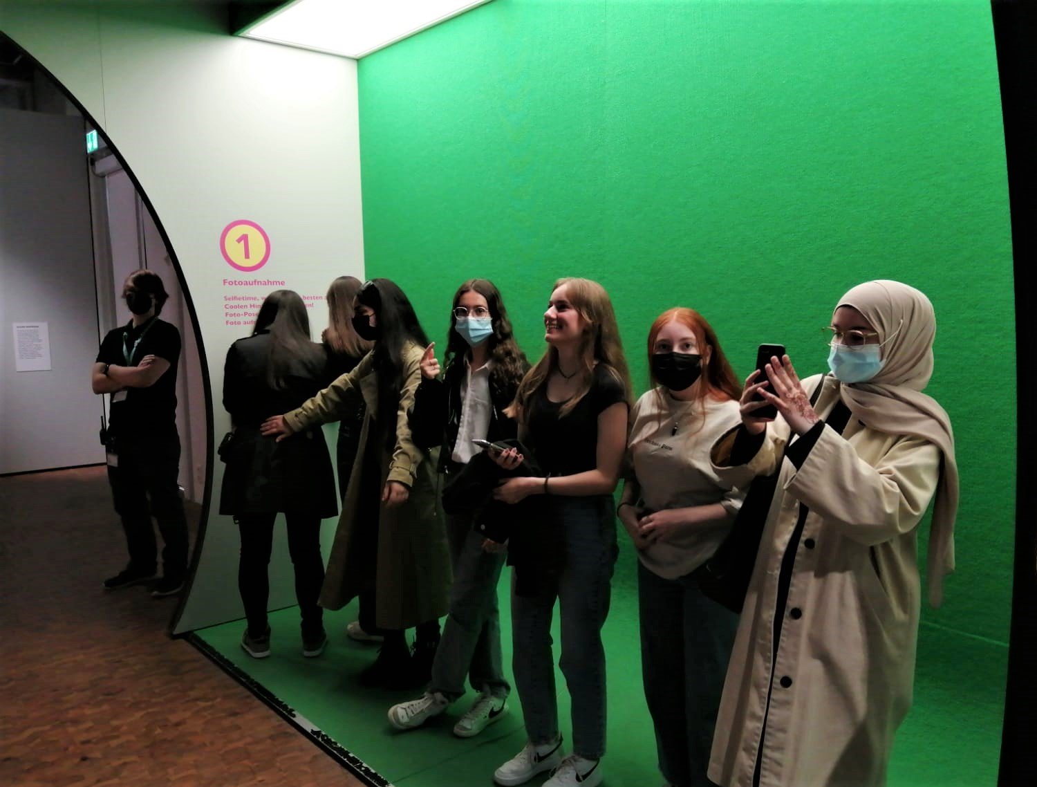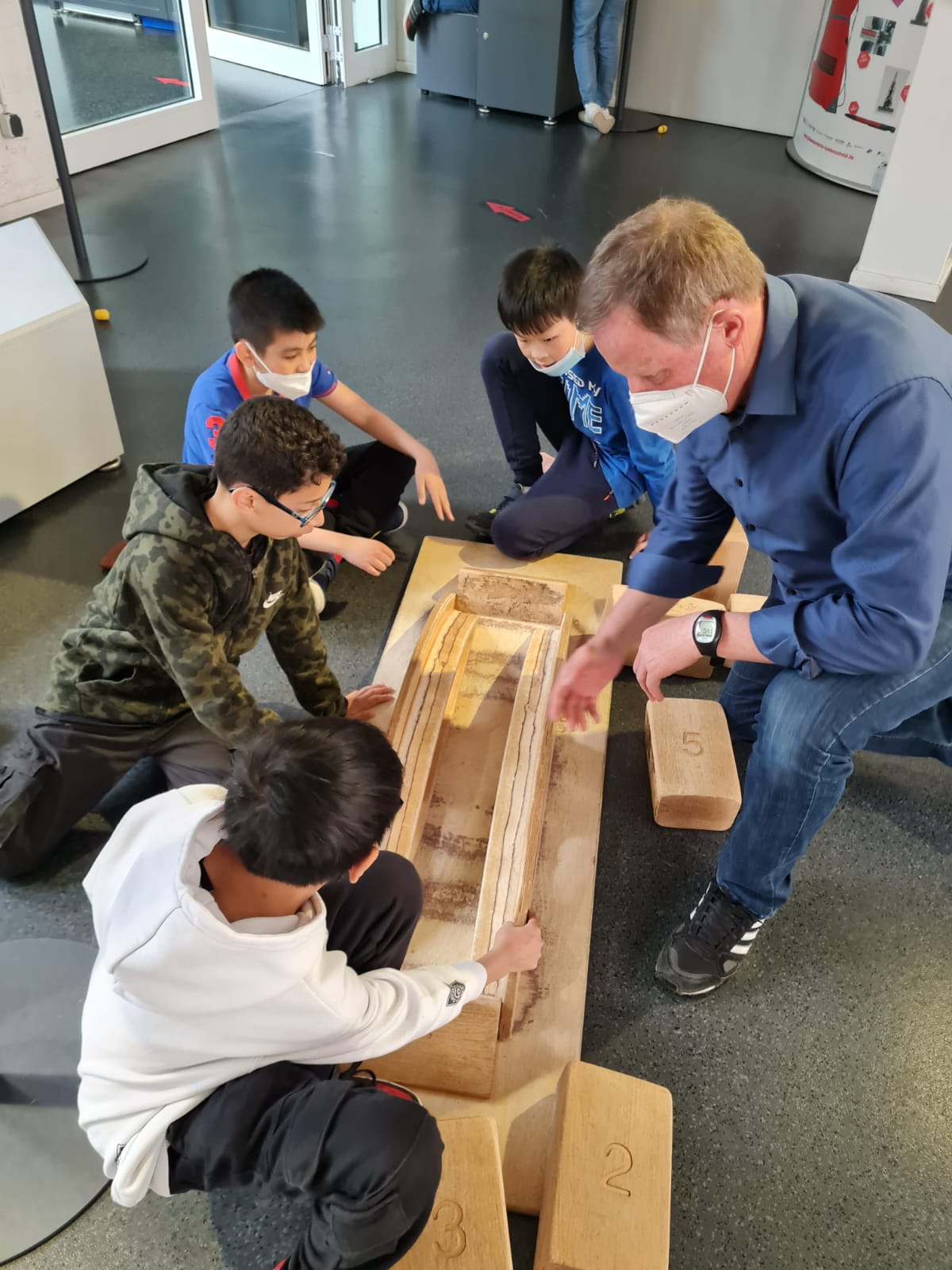 Die Hinfahrt dauerte gute eineinhalb Stunden. Inzwischen war es draußen so warm geworden, dass diverse Jacken im Bus liegenbleiben konnten. Der kurze Fußweg vom Busparkplatz über eine Brücke zum Haupteingang war schnell geschafft und nach einer Begrüßung und Einführung vor Ort ging es endlich los: die Fünftklässlerinnen und Fünftklässler konnten die Ausstellung auf eigene Faust in Kleingruppen entdecken.