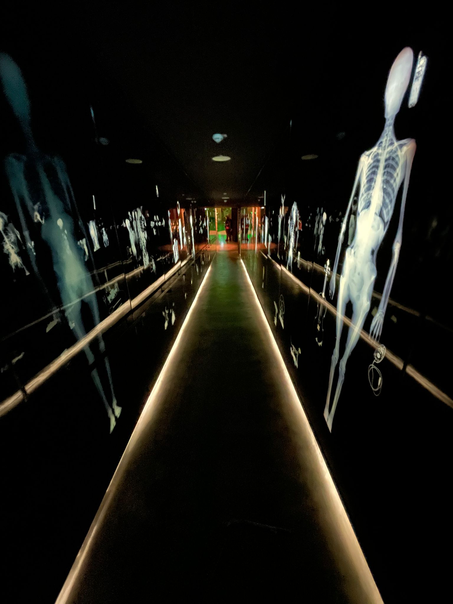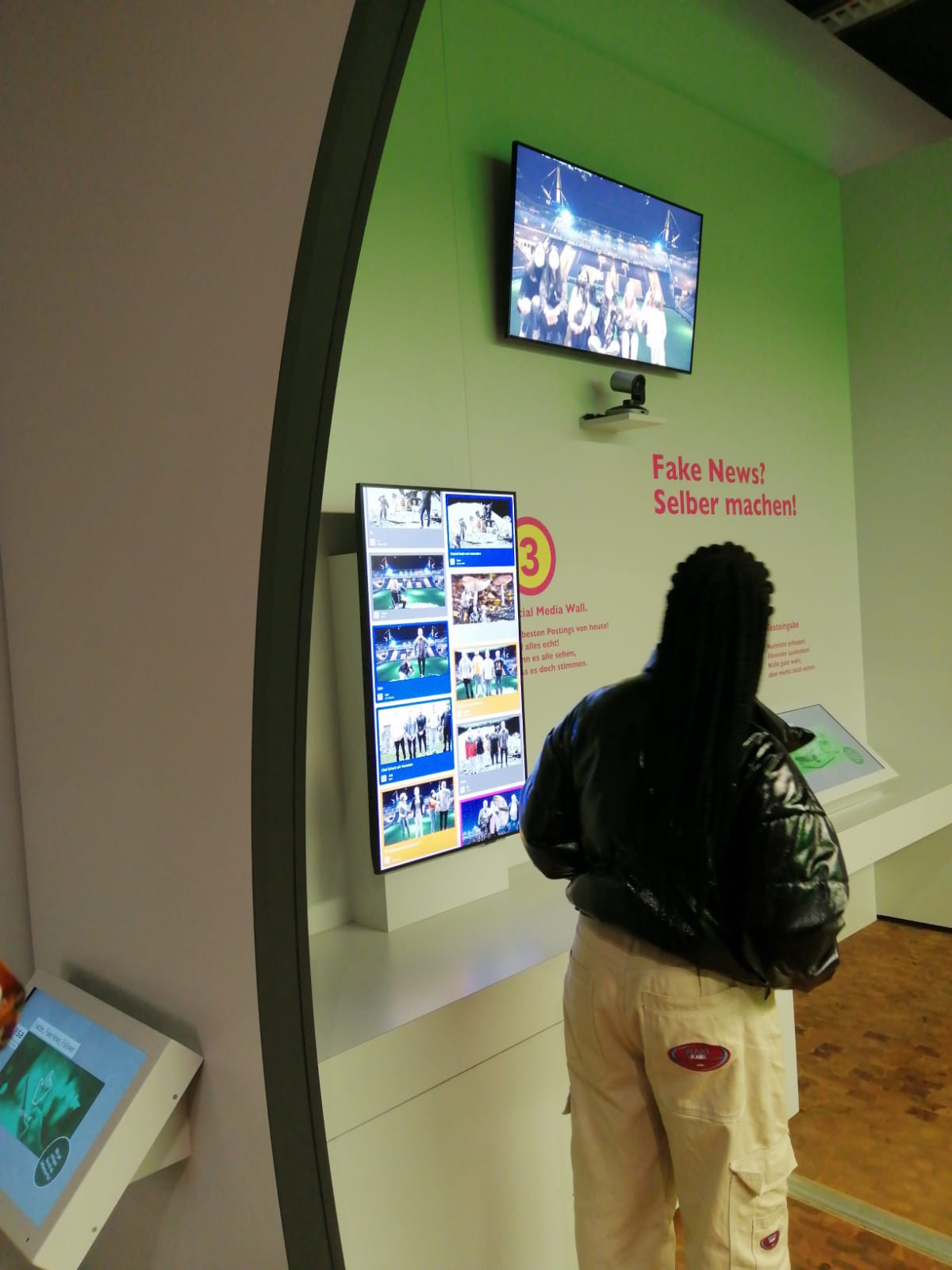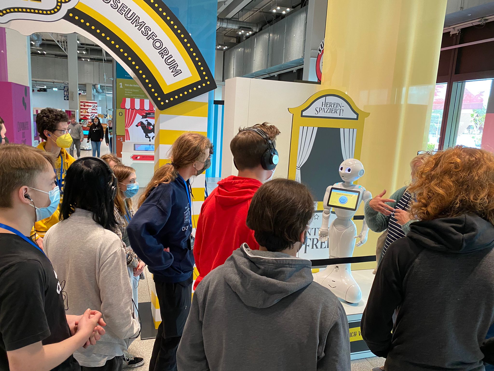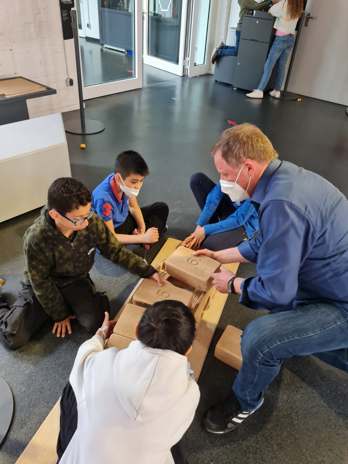 Die Hinfahrt dauerte gute eineinhalb Stunden. Inzwischen war es draußen so warm geworden, dass diverse Jacken im Bus liegenbleiben konnten. Der kurze Fußweg vom Busparkplatz über eine Brücke zum Haupteingang war schnell geschafft und nach einer Begrüßung und Einführung vor Ort ging es endlich los: die Fünftklässlerinnen und Fünftklässler konnten die Ausstellung auf eigene Faust in Kleingruppen entdecken.