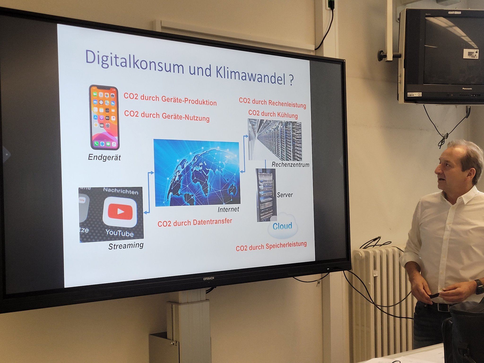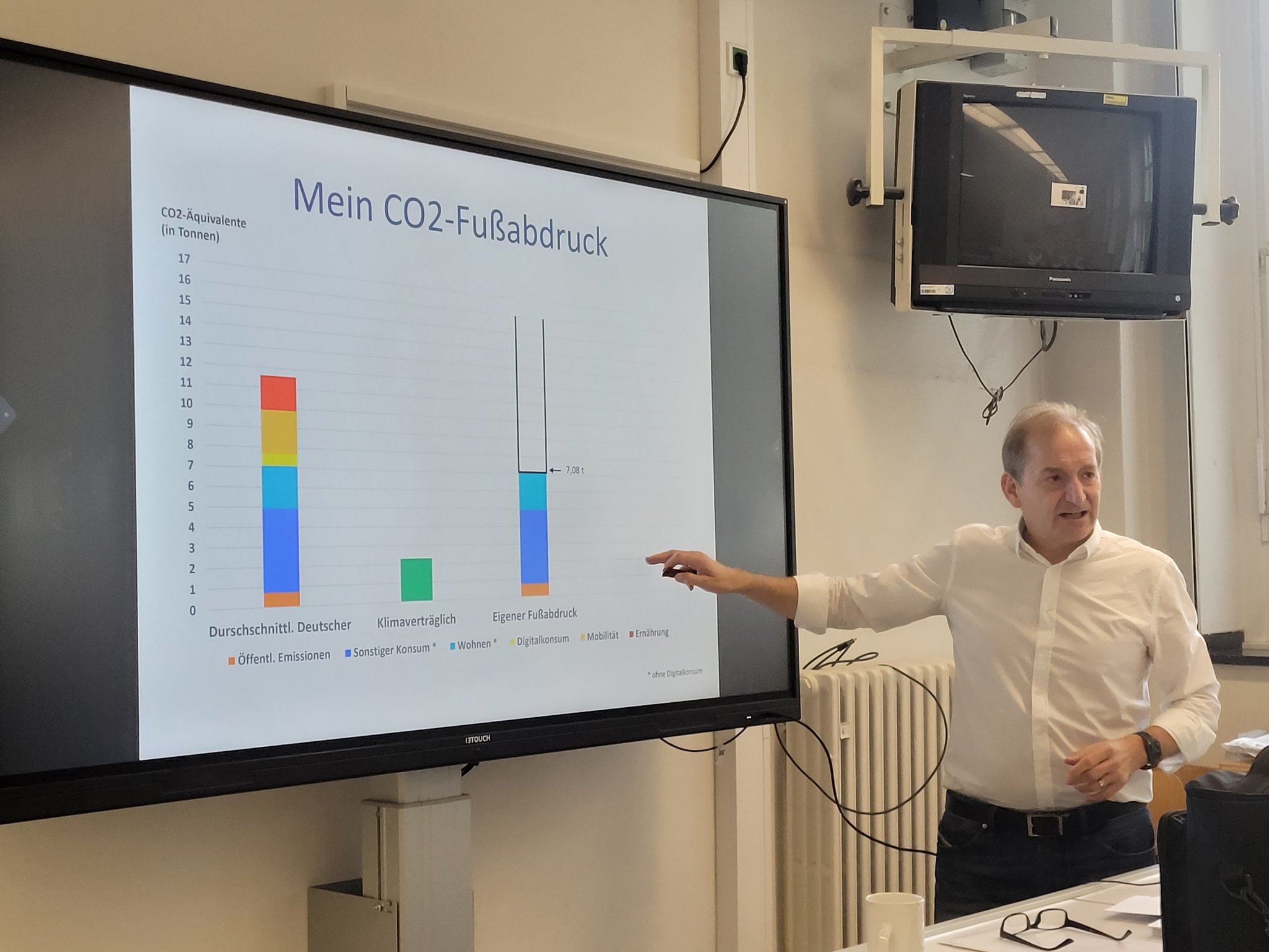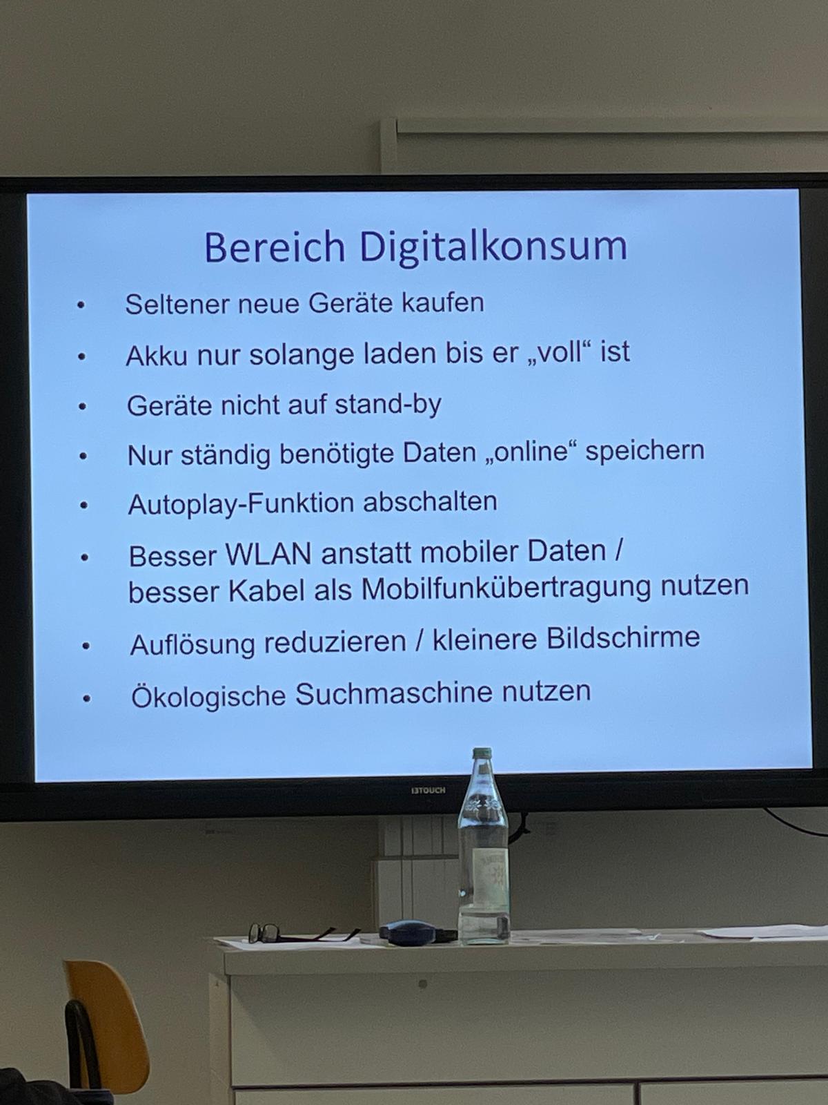 Zunächst gingen es um die Frage, welche Auswirkungen der Klimawandel hat und welche Gase klimarelevant sind. Mithilfe eines Fragebogens konnten alle ihren eigenen CO2-Fußabdruck bestimmen und mit Durchschnittswerten in Deutschland und anderen Ländern vergleichen. Außerdem konnten die Schülerinnen und Schüler nachschauen, wo es für sie noch Einsparpotential gibt. Welchen Einfluss haben Mobilität, Nahrung sowie Internet, Streaming und Social Media auf den CO2-Fußabdruck?