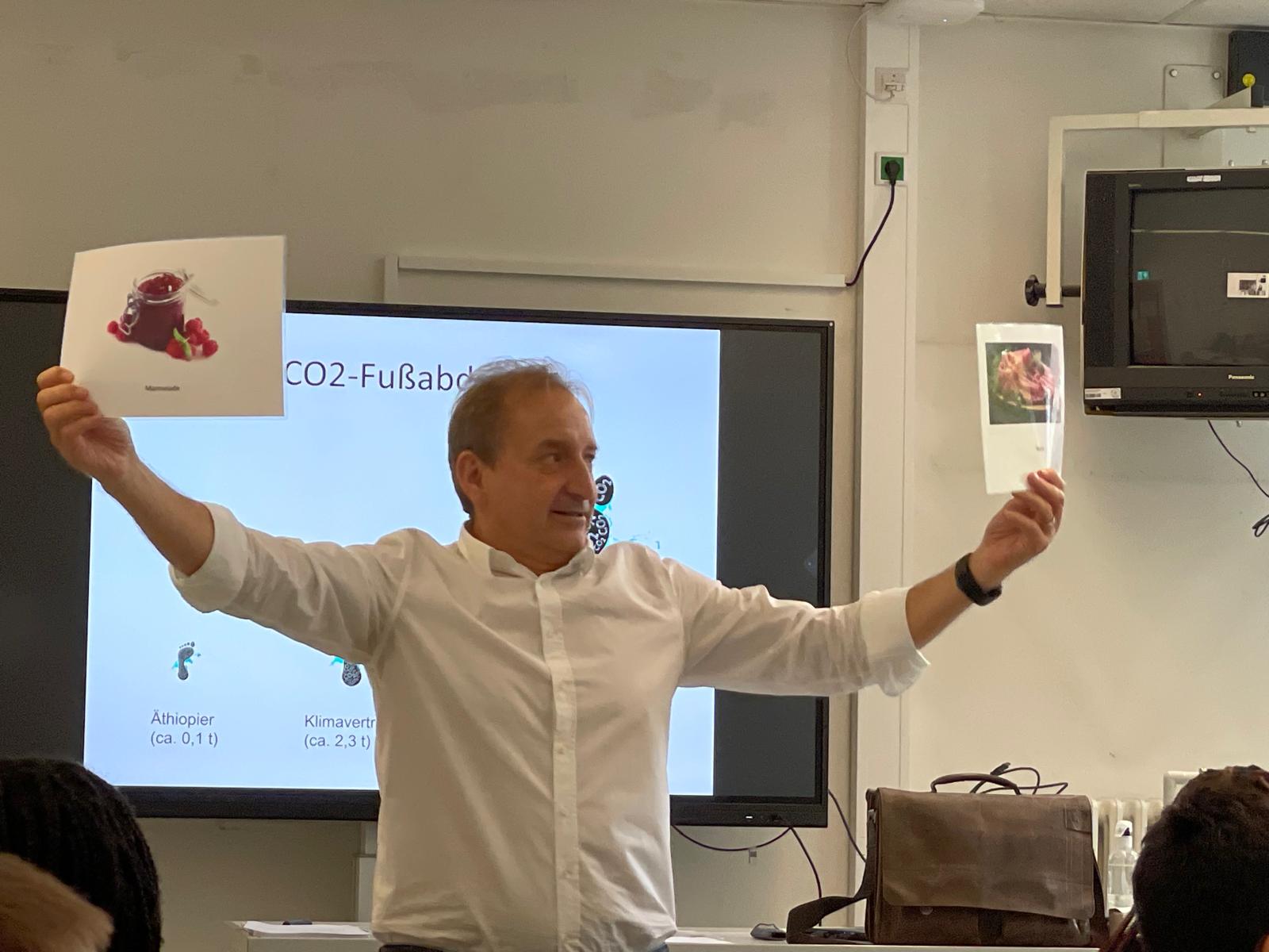 Herr Schultz ist ein häufiger und gern gesehener Gast am Burggymnasium. Seit Jahren besucht er verschiedene Jahrgangsstufen mit zahlreichen Workshops. Dieser Workshop der Deutsche Umwelt-Aktion e.V. wurde von der Sparkasse Essen finanziert.