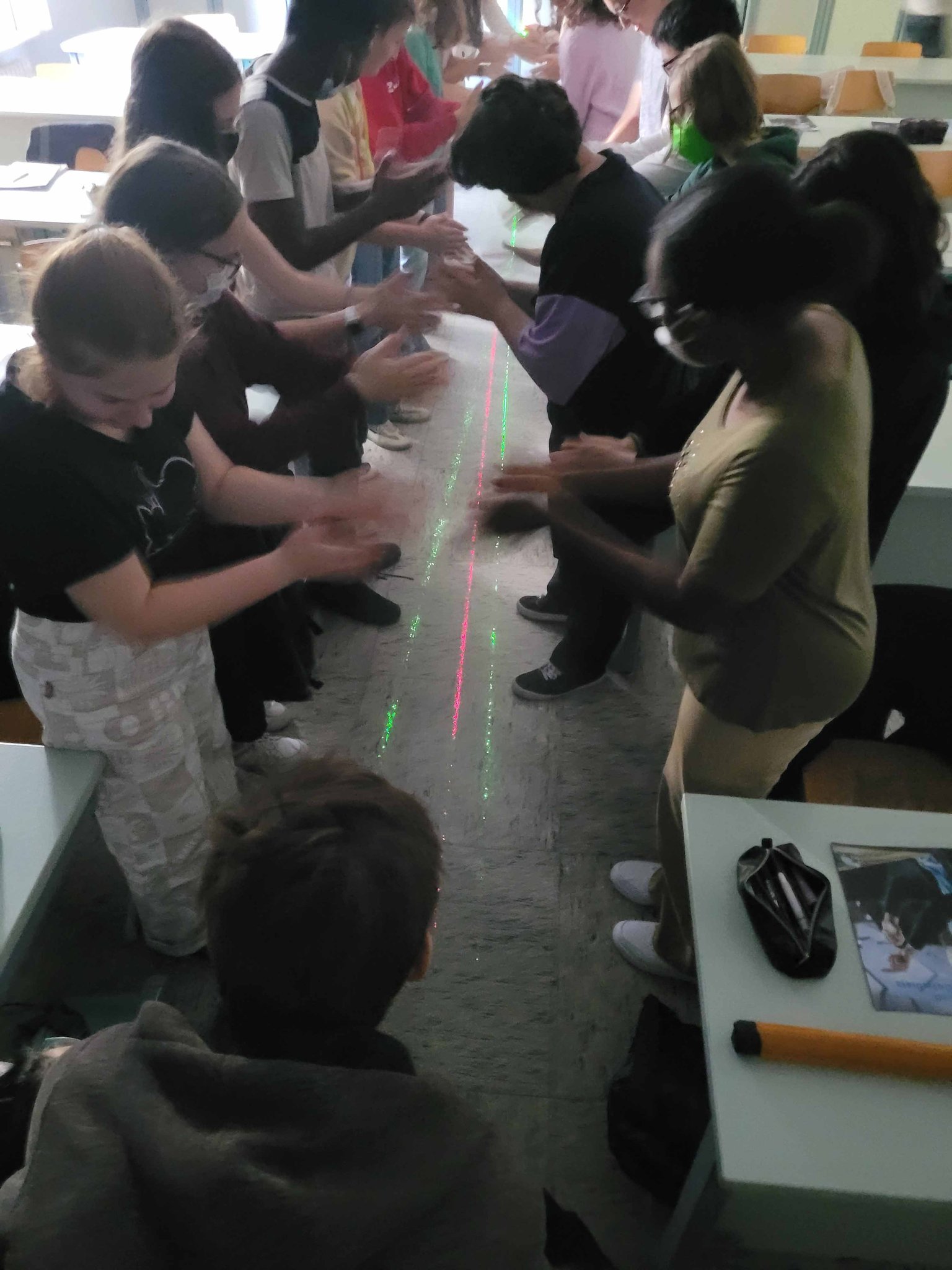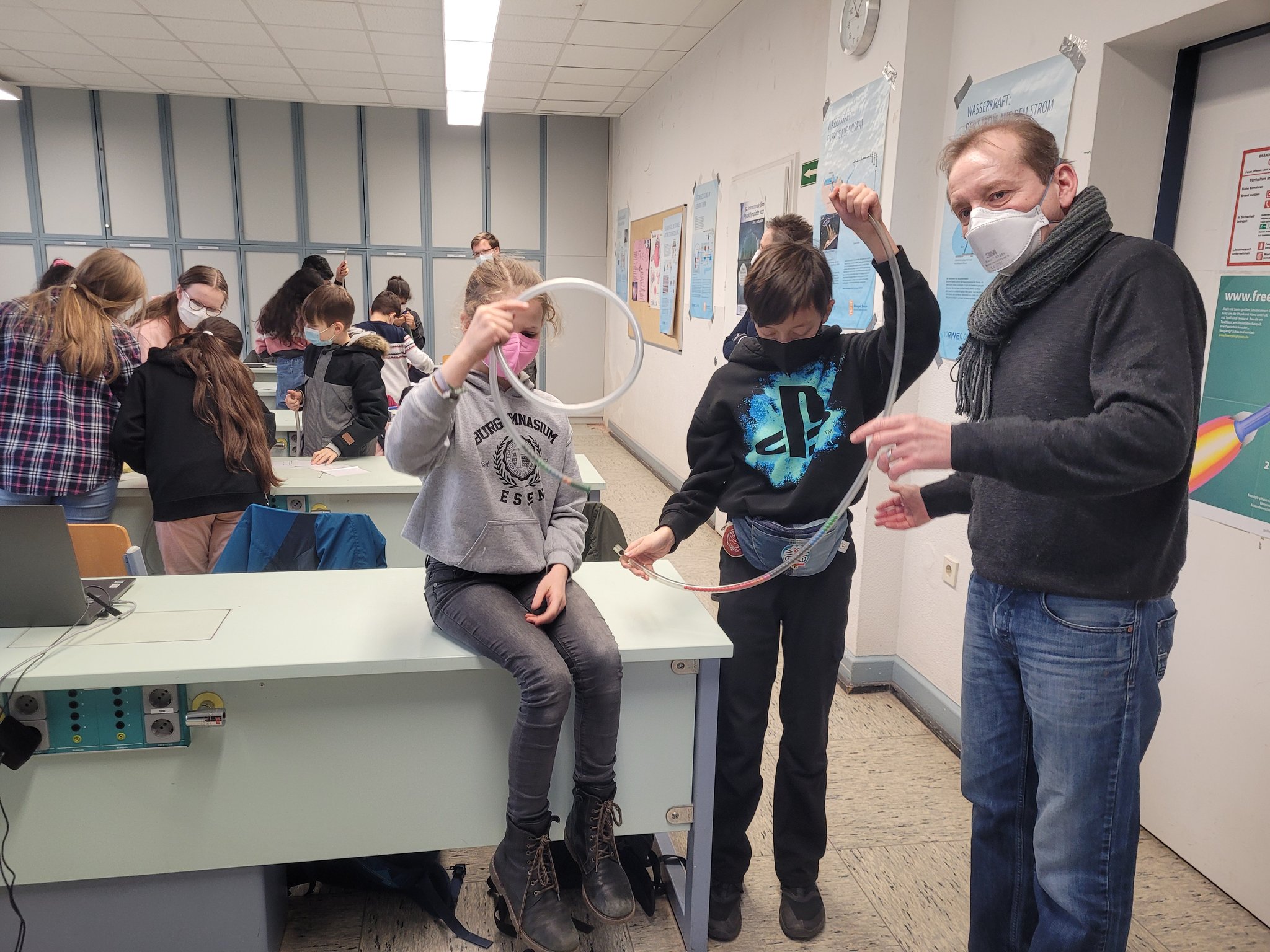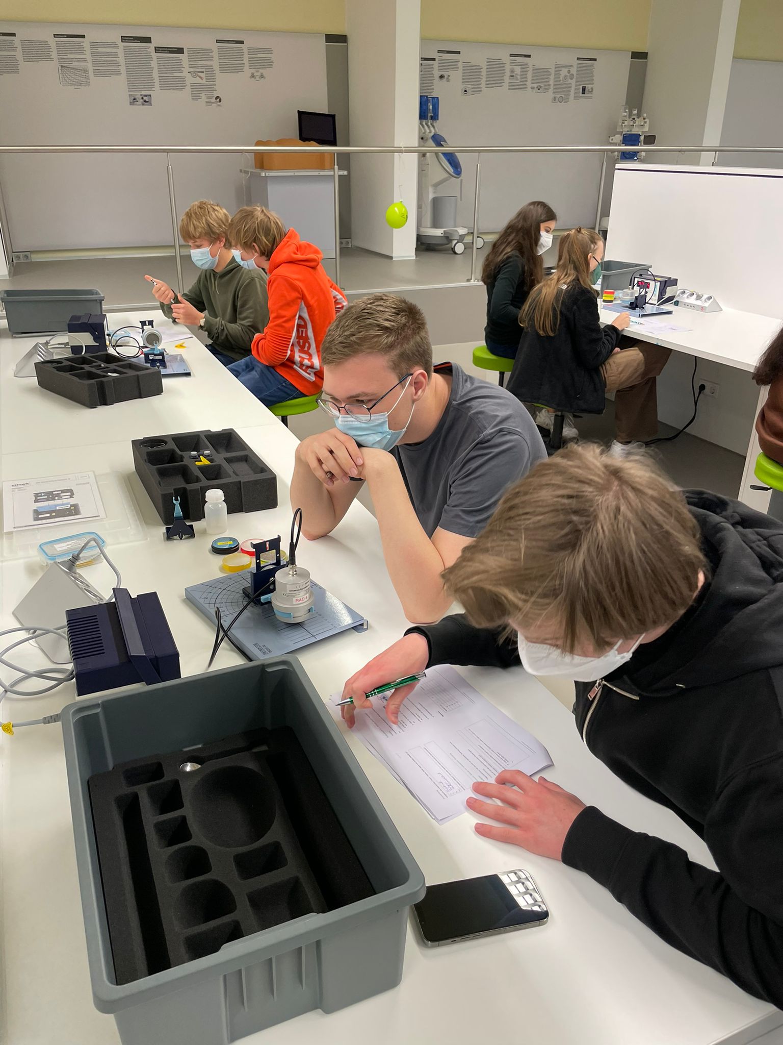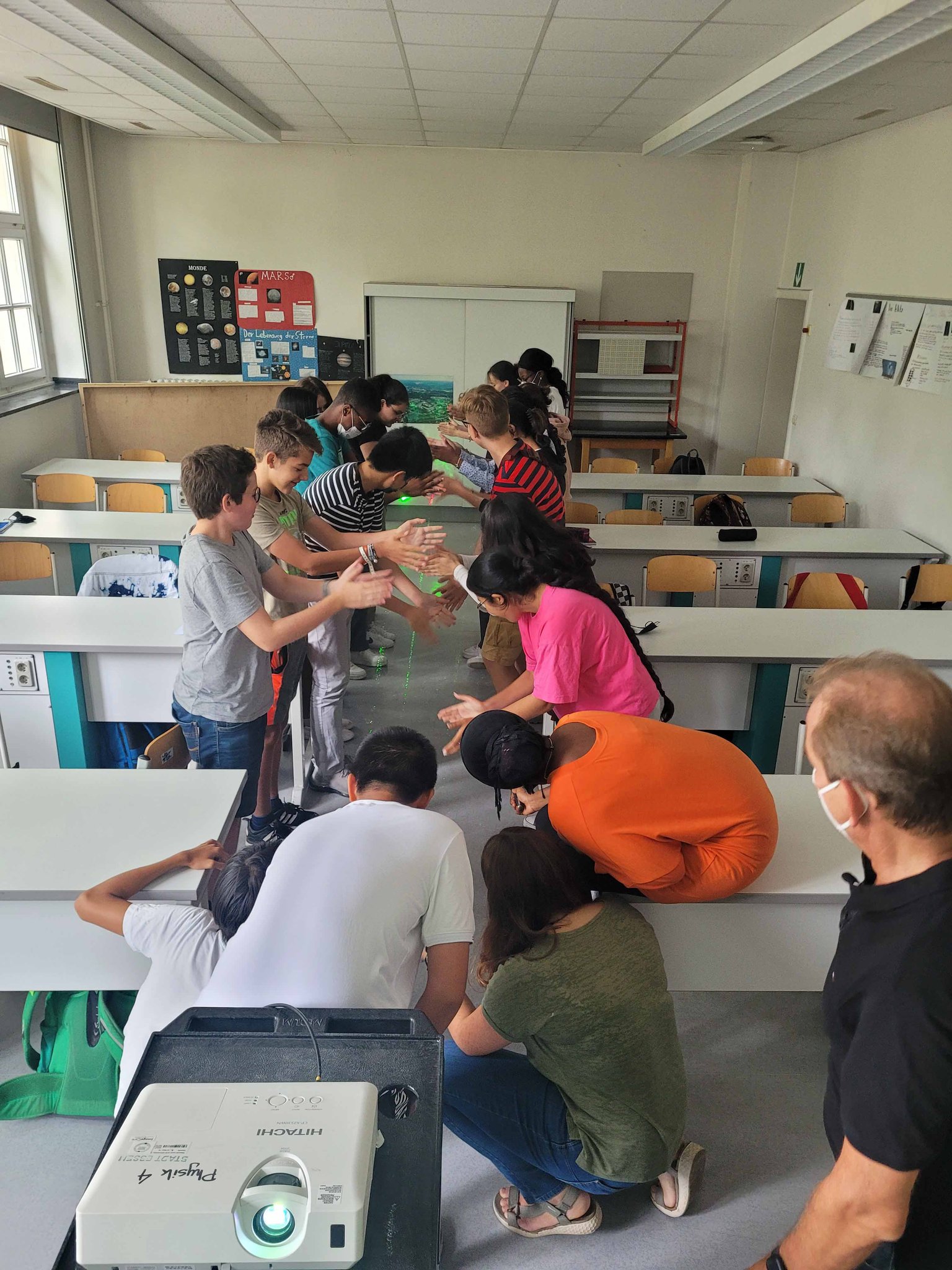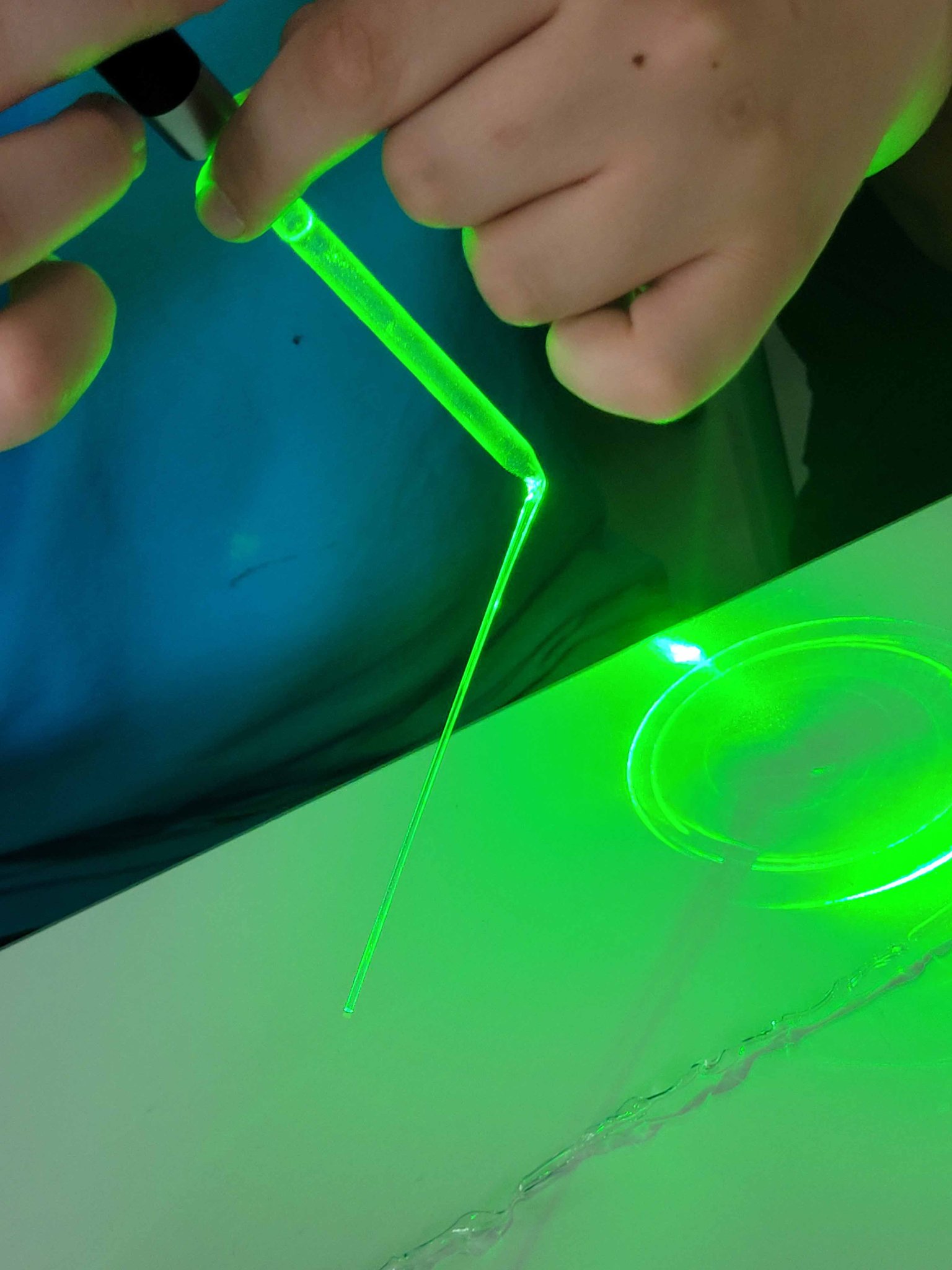 Die 9. Klassen haben sich bei dem Workshop "Mit Highspeed durch das Datennetz" zunächst mit der Geschichte der Kommunikation beschäftigt. Was ist Kommunikation, wie viele Sprachen sprechen wir, wie wurden Botschaften früher gesendet? Wie war der Weg vom Telefon zum Handy? Die Möglichkeit der Telekommunikation durch das Glasfaserkabel wird durch Experimente anschaulich gemacht, u. a. zu Datensignalen in Glasfasern, zur Herstellung von flexiblem Glas (Schülerinnen und Schüler ziehen selbst Glasfaser), zum Unterschied zwischen analoger und digitaler Technologie oder zur Frage, warum Laserlicht um die Kurve geleitet werden kann.