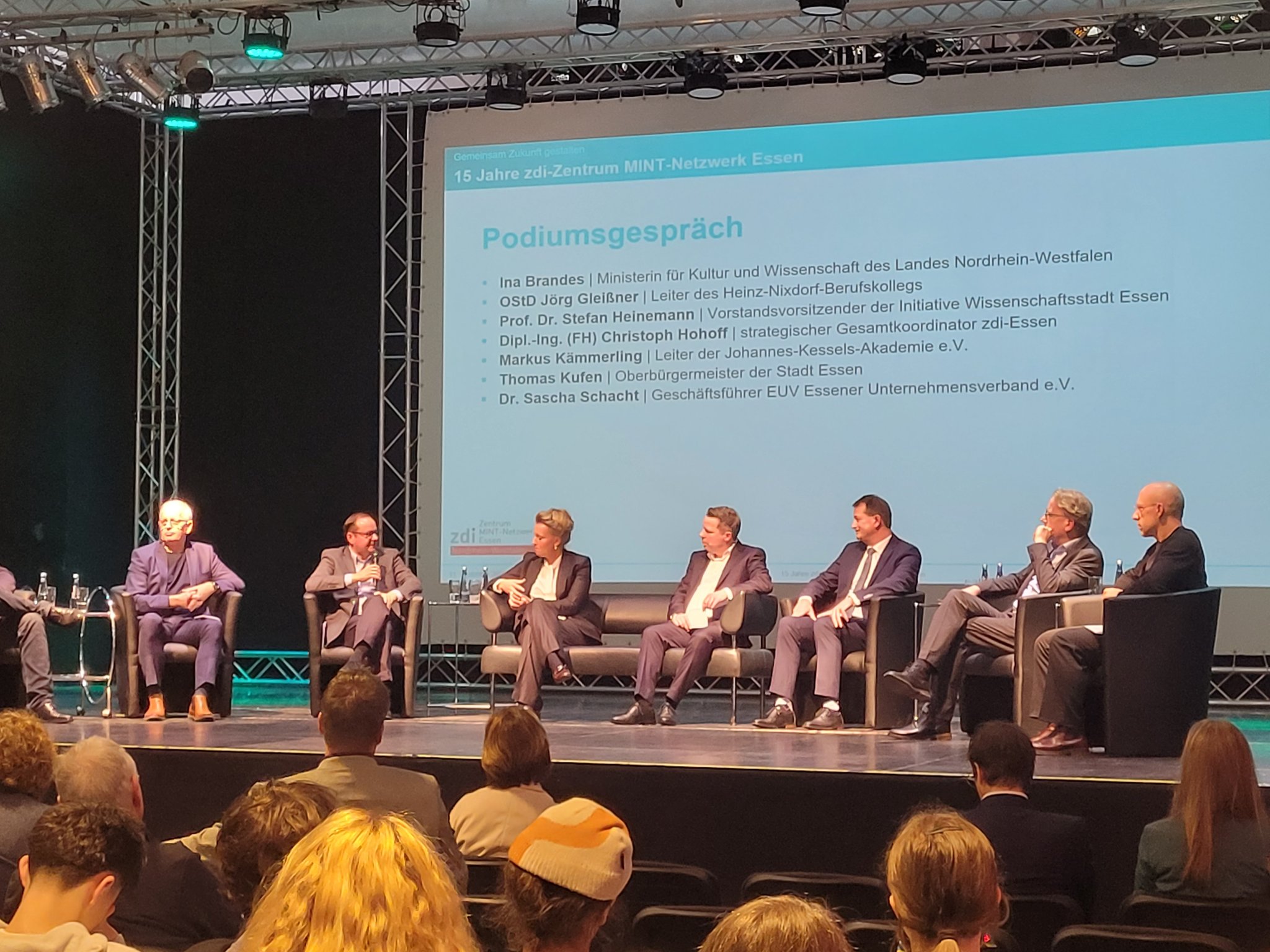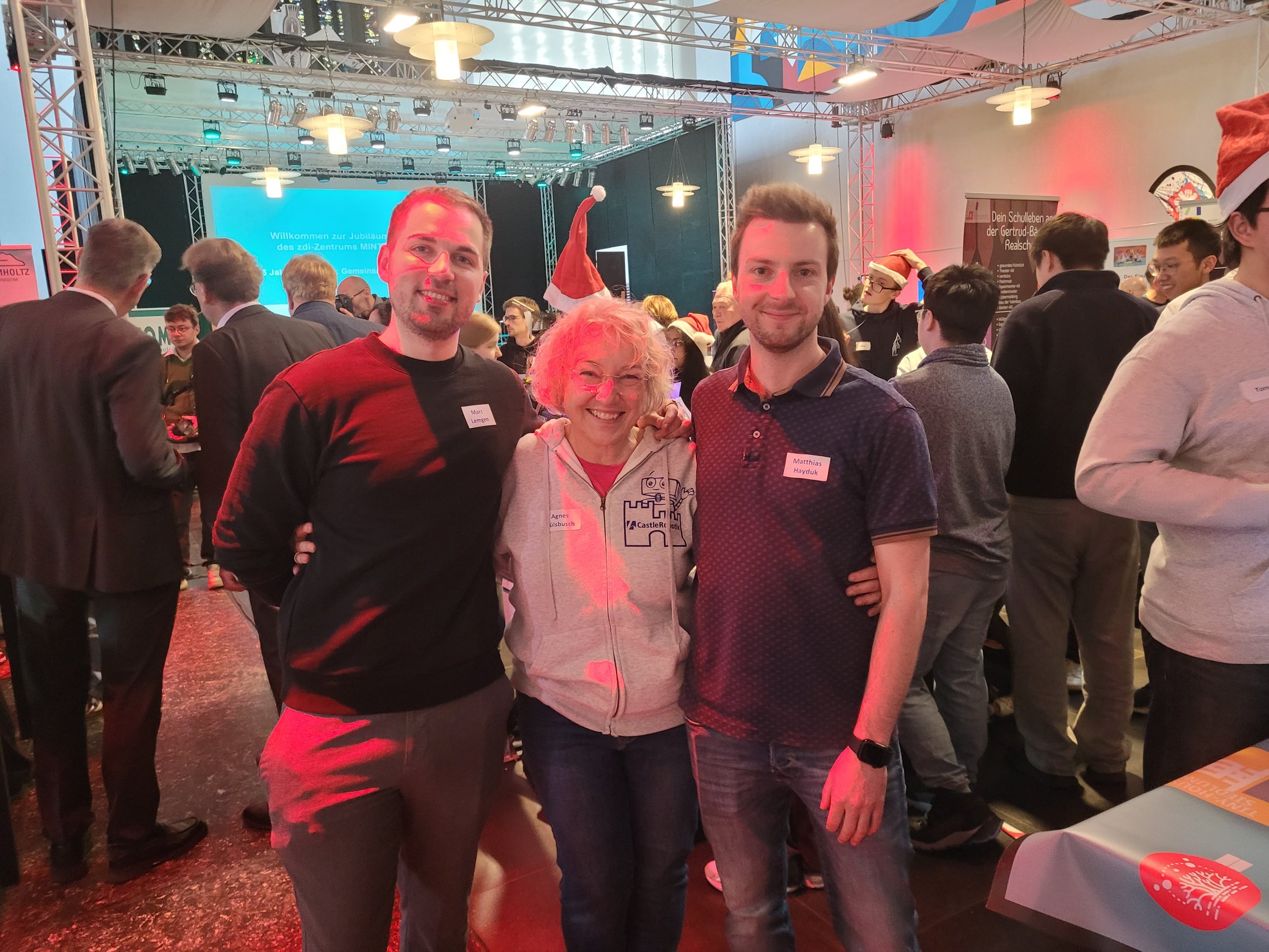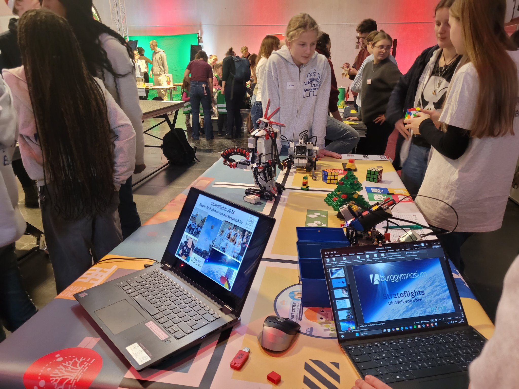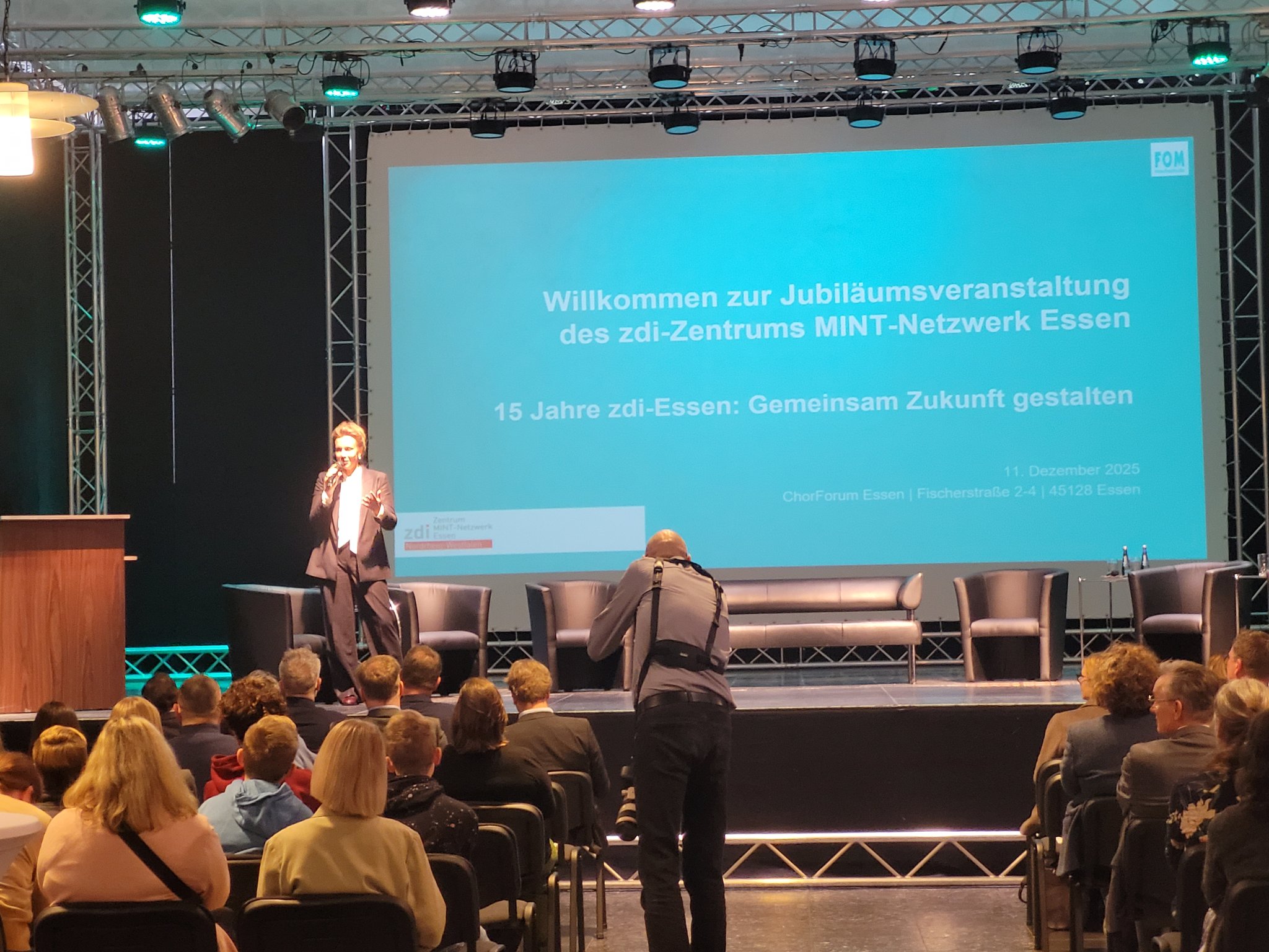 Der 11.12.2025 war ein ganz besonderer Tag: Das zdi-Zentrum MINT-Netzwerk Essen feierte sein 15-jähriges Jubiläum! Das Netzwerk hat sich als Aufgabe genommen, jungen Menschen für die MINT-Fächer zu begeistern. Das Burggymnasium nutzt regelmäßig die tollen Angebote des zdi-Netzwerks. Seit 2017 nimmt die Roboter-AG an den zdi-Roboterwettbewerben, an den Stratosphärenflügen sowie den Film- und KI-Film-Projekten teil. Die Burgschülerinnen und -schüler wurden eingeladen bei der Feier zwei Projekte vorzustellen: Die Roboter und den Stratosphärenflug. Es gab dort Infostände der Netzwerkpartner und man konnte an vielen Mitmachaktionen teilnehmen. Die besonderen Ehrengäste waren Frau Ina Brandes, die Ministerin für Kultur und Wissenschaft NRW sowie Herr Thomas Kufen, der Oberbürgermeister der Stadt Essen, die auch an der Podiumsdiskussion teilnahmen. In der Rede von Frau Ministerin Brandes wurde unsere Roboter-AG mit dem Hinweis auf die „beeindruckende Arbeit“, den besonders großen Anteil an Mädchen, Begeisterung und dem fantastischen Engagement ausdrücklich gelobt: „Bleibt bitte alle dabei, es ist ein Vergnügen Euch zuzugucken“.