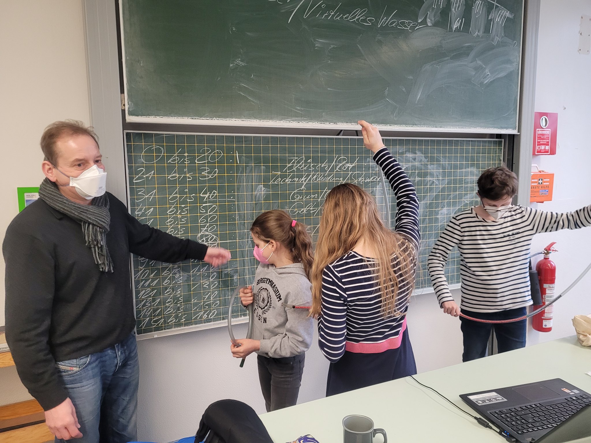 Was sich unter der Bezeichnung "Virtuelles Wasser" verbirgt, haben die Schülerinnen und Schüler der Klassen 5 und 6 sowie der EF in dem gleichnamigen Workshop erfahren. Virtuelles Wasser bezeichnet die Menge Wasser, die tatsächlich für die Herstellung eines Produkts anfiel. Für eine Frucht Avocado sind unglaubliche 1000 l Wasser nötig, für einen Burger 2400 l Wasser. Der Wasserbedarf steigt unaufhörlich und gleichzeitig wird diese endliche Ressource weltweit immer knapper. Viele Informationen und auch die Ermittlung des eigenen Wasserbedarfs gaben unseren Schülerinnen und Schülern Denkanstöße, die sie bestimmt auch in ihre Familien transportieren. Wasser ist schließlich Grundlage allen Lebens.