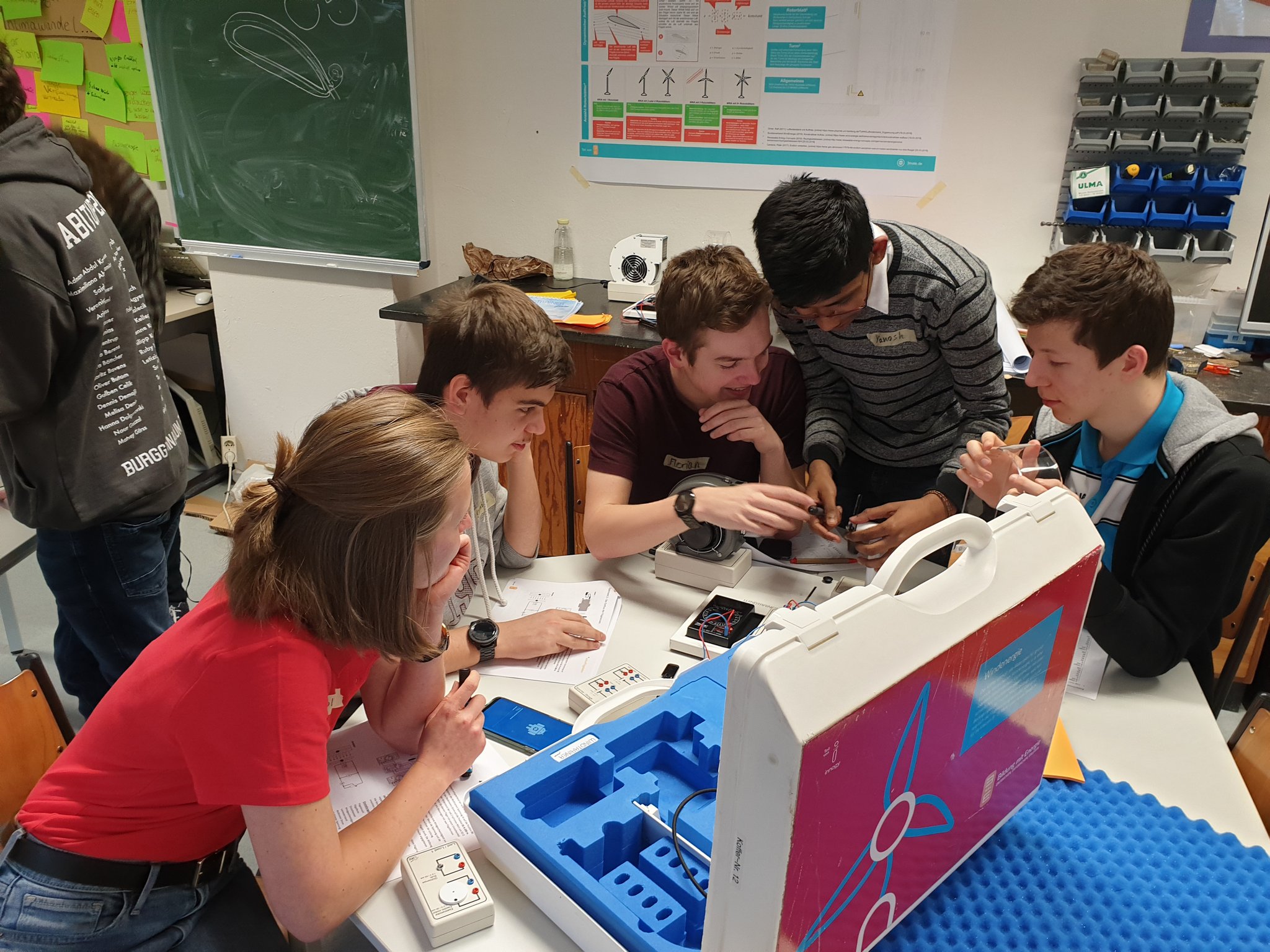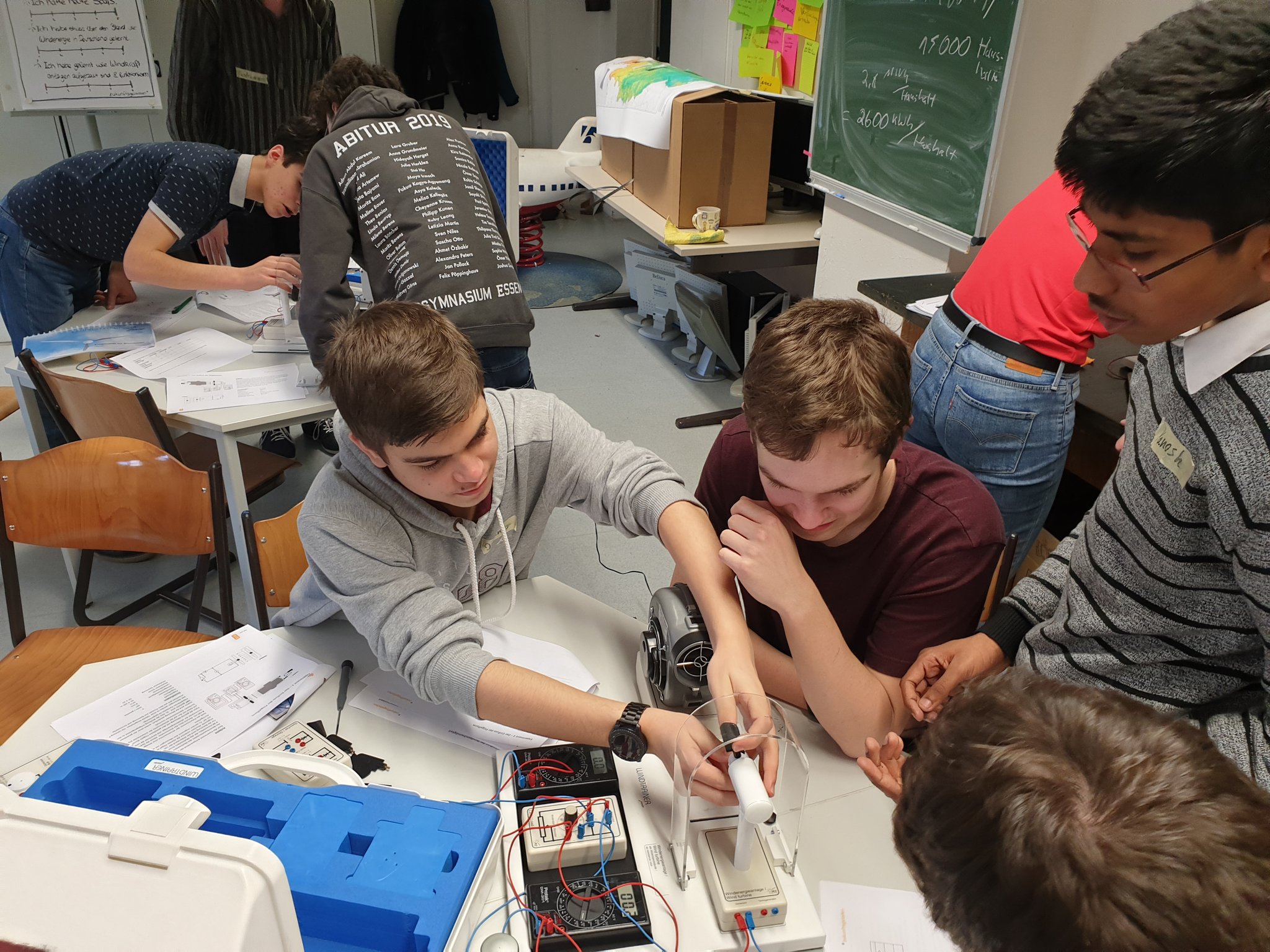 Die Burg forscht-AG hat die Eigenverantwortung in Bezug auf Energie und Nachhaltigkeit diskutiert und dazu ihren eigenen Energiebedarf mit einer Computersoftware ermittelt. Durch das Spielen mit den Werten konnten sie direkt erkennen, an welchen Stellen sie ansetzen können, um den eigenen Energiebedarf am effektivsten zu reduzieren. Mit den Experimentierkästen erforschten sie die Gewinnung der Energie aus regenerativen Energiequellen wie Wind und Sonne. Sie planten und berechneten für die eigene Schule eine Photovoltaikanlage, so dass das Burggymnasium unabhängig von einem Stromversorger funktionieren könnte. Dabei beachteten sie alle Aspekte, die für die Photovoltaikanlage relevant sind, wie die Wirtschaftlichkeit aber auch Ausrichtung des Gebäudes zur Sonne, Denkmalschutz etc.