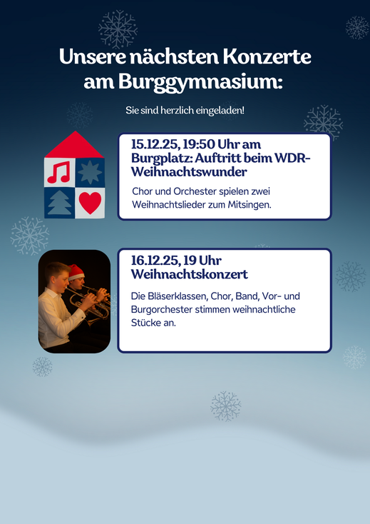 Ferner laden wir Sie herzlich ein zu unserem traditionellen vorweihnachtlichen Konzert am Dienstag, dem 16. Dezember, um 19 Uhr in der Aula des Burggymnasiums.