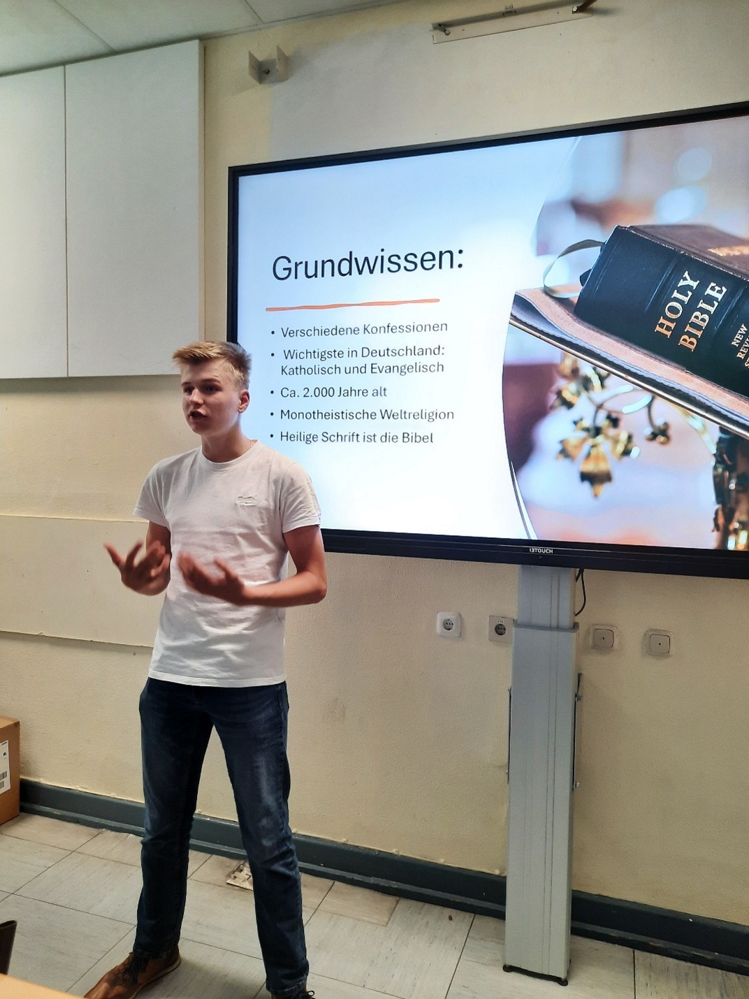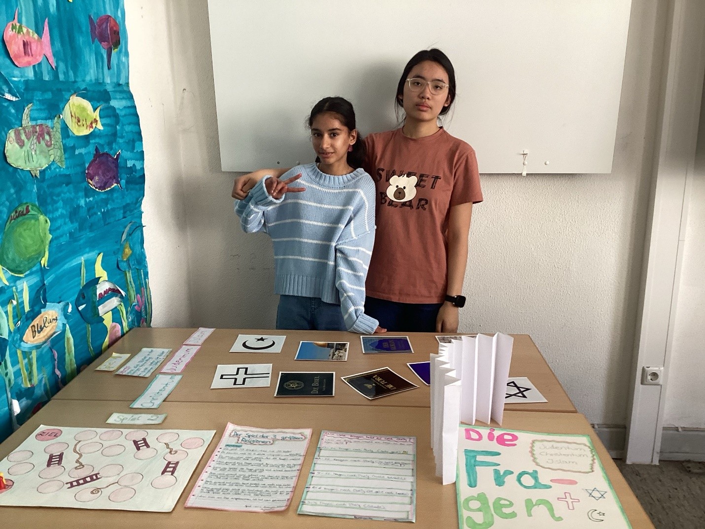 In der Jahrgangsstufe 6 lernten die Schülerinnen und Schüler im Fach Praktische Philosophie die Geschichte, Sitten und Bräuche der drei großen Weltreligionen Christentum, Islam und Judentum kennen. Welche Gemeinsamkeiten und Unterschiede haben diese Religionen. Im Rahmen einer Projektarbeit erstellten die Schülerinnen und Schüler ein Religionsspiel, in welches beispielsweise durch das Stellen von Quizfragen die Unterrichtsthemen eingearbeitet werden.